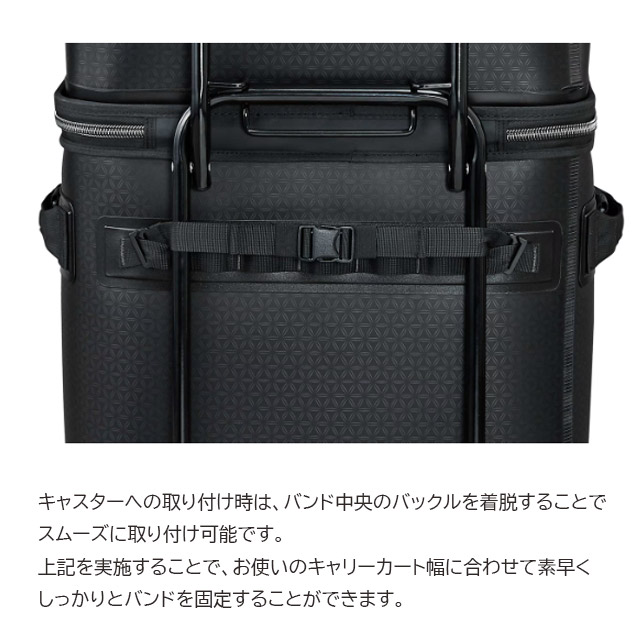 ゴムバンドを使用しなくても、キャリーカートに取り付け可能なバンド付き。