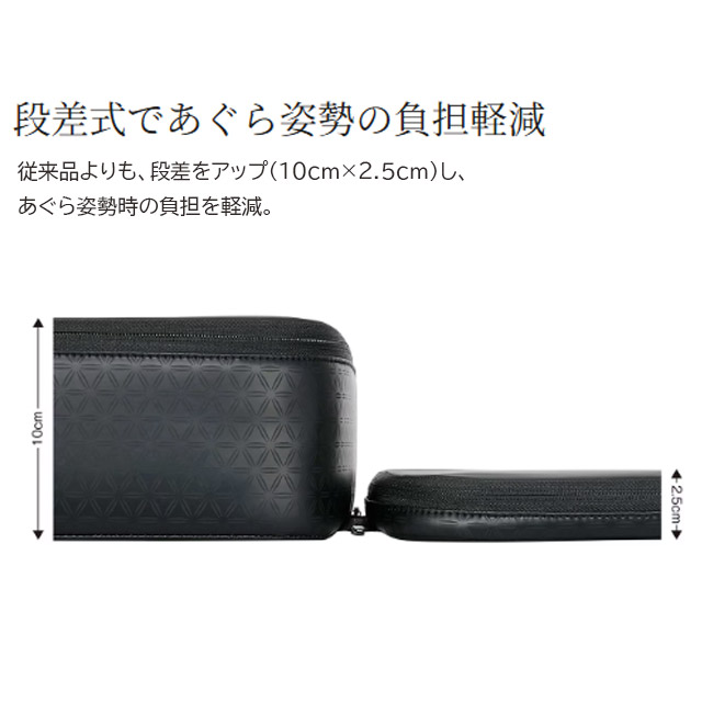 従来品よりも、段差をアップ(10cm×2.5cm)し、あぐら姿勢時の負担を軽減。