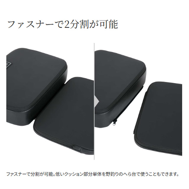 ファスナーで分割が可能。低いクッション部分単体を野釣りのへら台で使うこともできます。