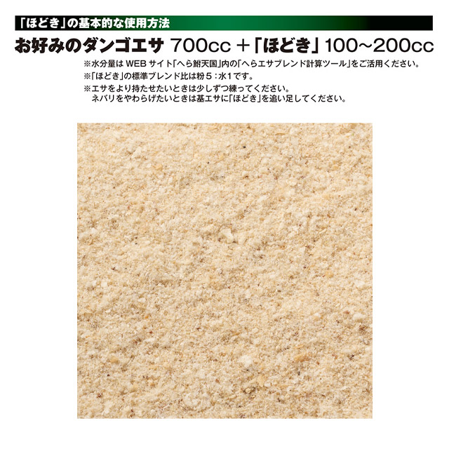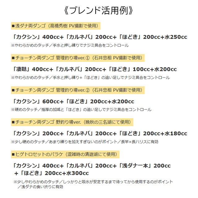 ダンゴの共エサ、バラケエサにブレンドすると経時変化によるエサの持ちすぎ現象の発生をやわらげることができます。練り加減の調節や、ネバリのつきすぎたエサへの追い足しがしやすいため、エサの芯の残り具合がコントロールできます。練っても重さがでにくいため、軽くてネバリのあるエサの調整にもおすすめです。